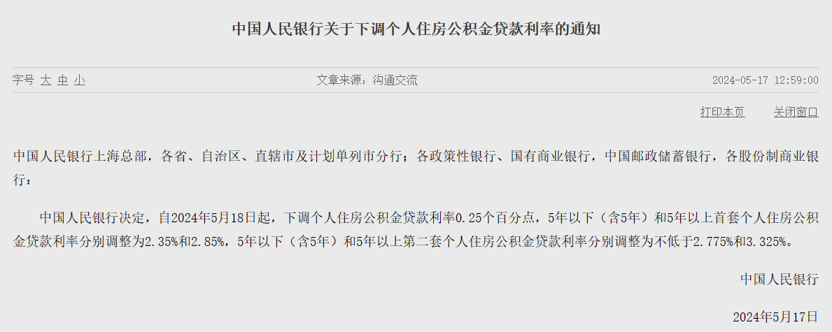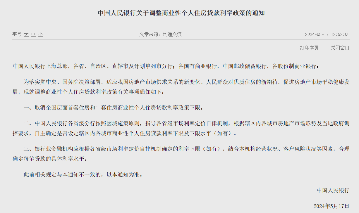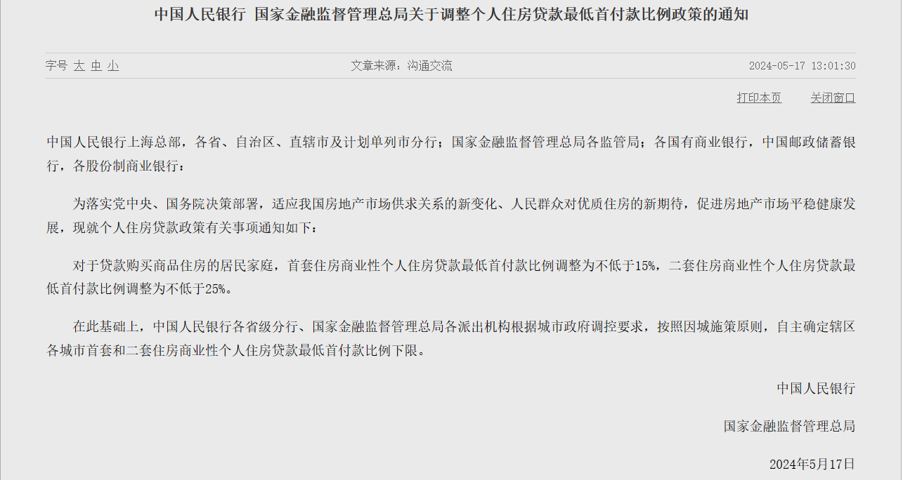 5月17日,央行、金融监管总局接连发布3条关于住房贷款方面的通知,从贷款利率、首付比例两方面进行调整,政策原文如下: