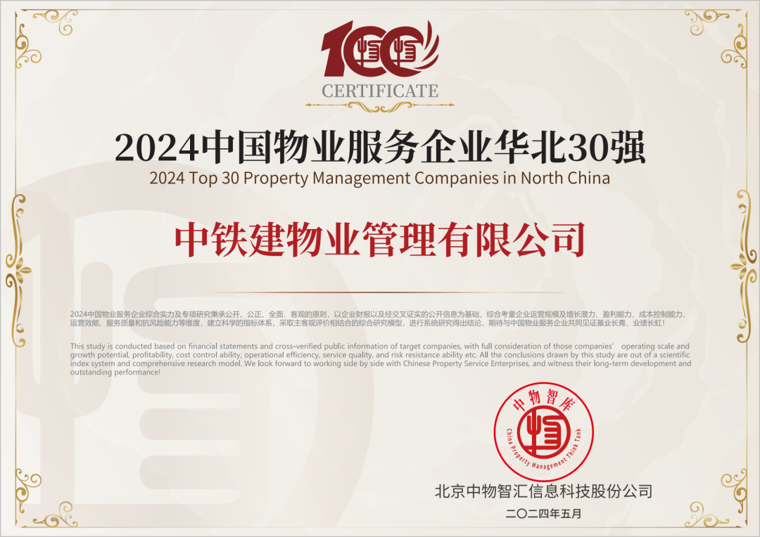 其中,中铁建物业管理有限公司荣获“2024中国物业服务综合实力百强企业 第14名”“2024中国物业国有企业50强”及子榜“2024中国物业服务企业华北30强”“2024中国标杆物业服务项目”奖项。